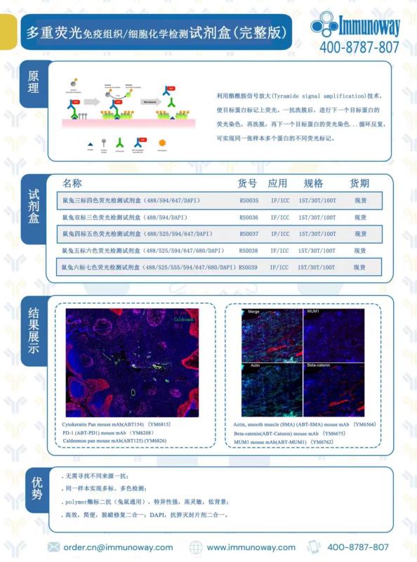 利用酪酷胺信號放大(Tyramide signal amplification)技術(shù)使目標(biāo)蛋白標(biāo)記上熒光。一抗洗脫后,進(jìn)行下一個目標(biāo)蛋白的熒光染色,再洗脫,再下一個目標(biāo)蛋白的熒光染色...循環(huán)反復(fù)可實(shí)現(xiàn)同一張樣本多個蛋白的不同熒光標(biāo)記。