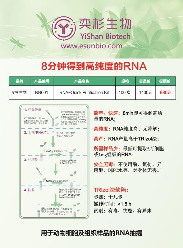 你還在為RNA提取而困擾嗎?別擔心,奕杉生物攜手眾合作伙伴為您奉上一款全新的RNA快速提取試劑盒(貨號:RN001,促銷價:980元,可提供試用裝),短至8分鐘,即可得到高質(zhì)量的RNA。